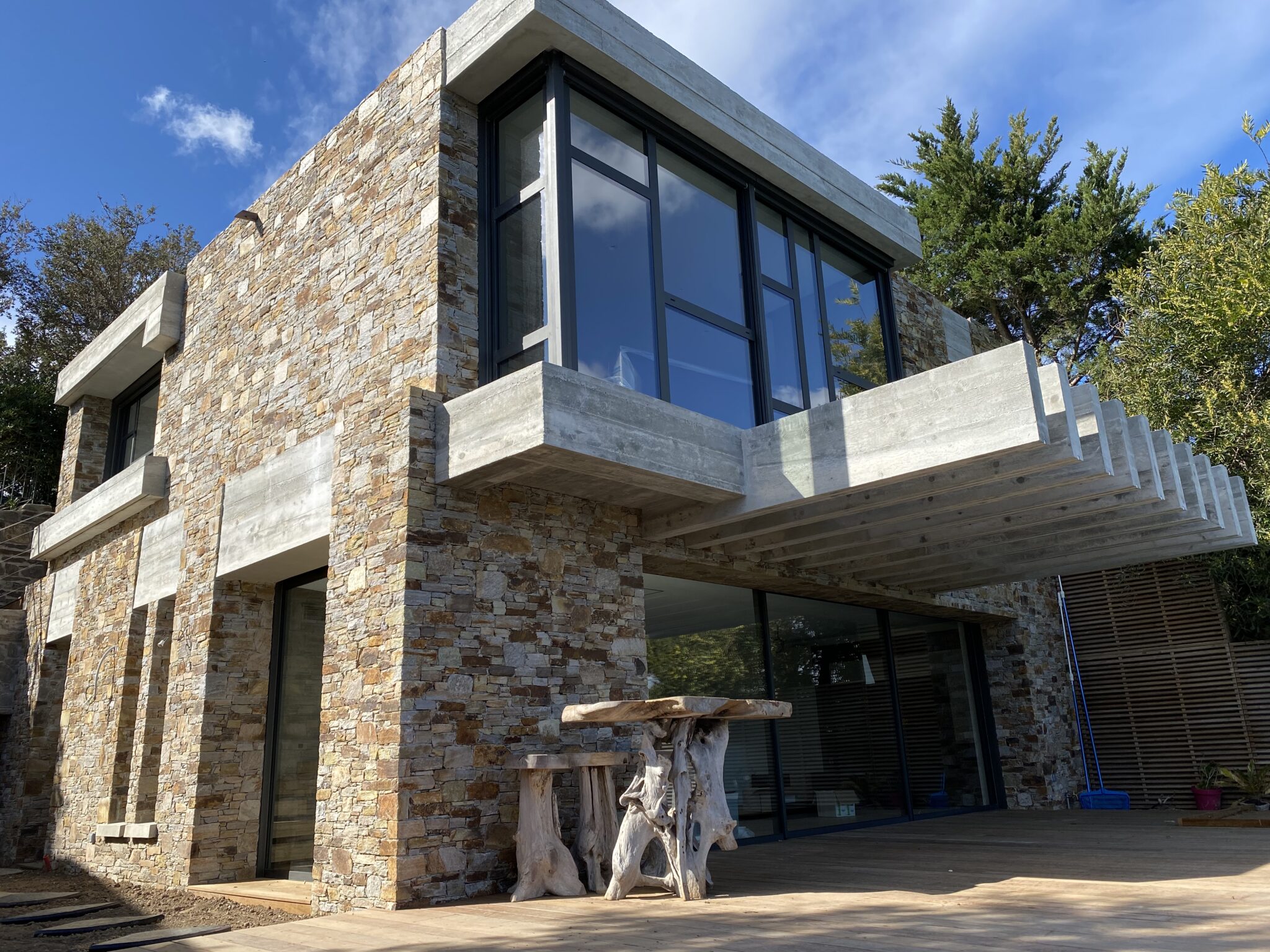Enfin, la pierre de Bormes, caractéristique des villas du domaine, vient s'associer parfaitement avec le béton apparent du projet.